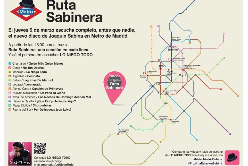 Cadascuna de les 12 cançons del disc sonarà en una estació diferent de les 12 línies del metro madrileny: és el que la discogràfica Sony Music ha anomenat La ruta Sabinera. Així, els que vulguin escoltar en exclusiva el disc sencer, faran un itinerari pel metro de la capital, seguint l’ordre de les estacions i començant per la línia 1: a partir de les 18h, a Chamartín (línia 1) sonarà Quien más quien menos’. Seguidament, a l’estació Canal de la línia 2, No tan deprisa, mentre que a Moncloa (línia 3) es punxarà Lo niego todo’, i així successivament.