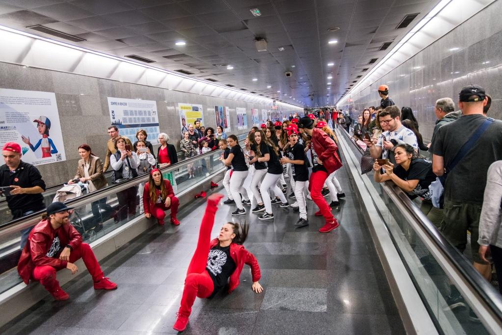 Al migdia, al passadís d’enllaç entre les estacions de metro de Diagonal de les línies 3 i 5, la percussió de Brincadeira, una seixantena d’alumnes de dansa i els Brodas han ofert un tast de l’espectacle Vibra, que fusiona diferents estils de coreografies urbanes amb percussió.
