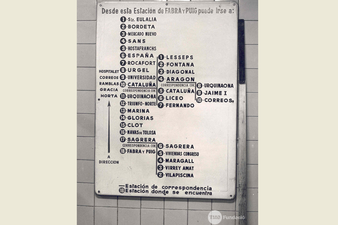 La imatge històrica d'aquesta setmana ens mostra un panell indicador que fa molts anys estava instal·lat a l'estació de Fabra i Puig de la línia 1 de metro. Fins a quin any hem retrocedit? Publicarem la resposta a la nostra pàgina de Facebook i al Twitter corporatiu @TMB_Barcelona.