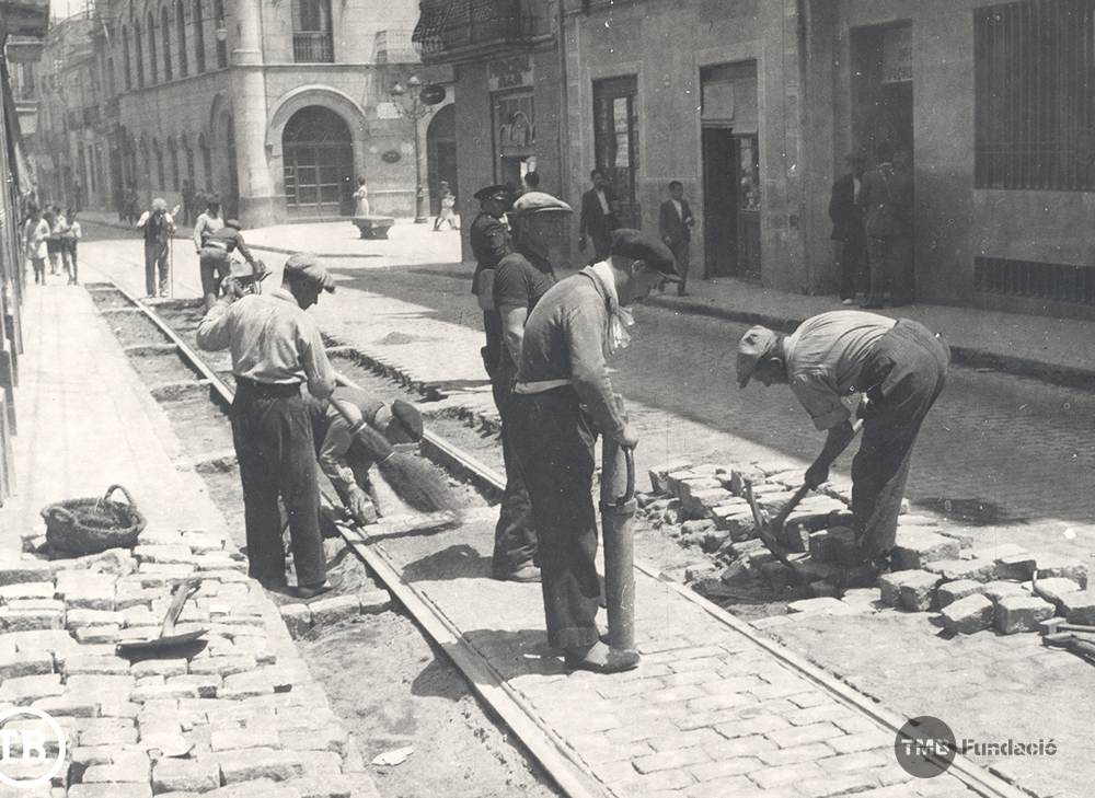 Viatgem a l'any 1936, en aquest carrer uns obrers munten les vies per on circularà un mitjà de transport mític: el tramvia. L'enigma de la fotografia històrica és si sabeu reconèixer quina és la ciutat de la imatge. Publicarem la resposta a la pàgina de Facebook i al Twitter @TMB_Barcelona.