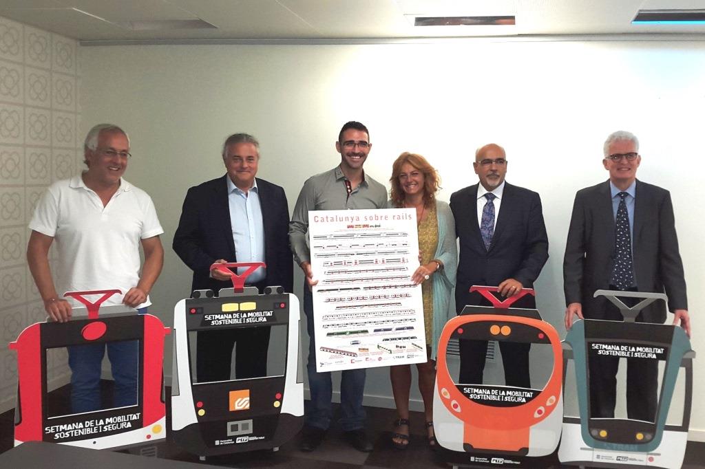 En el marc de la Setmana de la Mobilitat 2016, avui s’han mostrat els primers exemplars del pòster Catalunya sobre rails, una obra gràfica de gran format que mostra la diversitat, l’arrelament i la potència (més de 600 milions de viatges anuals) dels sistemes de ferrocarril existents al nostre país, des dels més modestos funiculars fins a l’alta velocitat, passant pels metros.