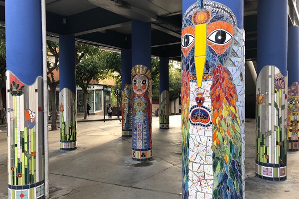 Des de fa uns dies, un mosaic colorista saluda els hospitalencs i usuaris que accedeixen o surten de l'estació de metro de Santa Eulàlia de la línia vermella. I la intervenció urbana no és en una paret o en forma de mural: es tracta de les columnes ubicades davant l'entrada del suburbà, sota el pont de la Torrassa, a l'avinguda del Metro cantonada amb el carrer Santiago Ramón y Cajal, a l'Hospitalet de Llobregat.