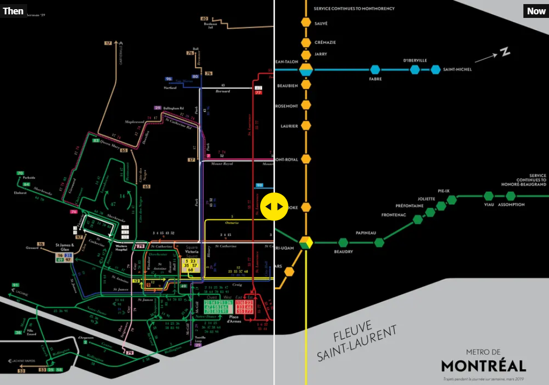 L'artista Jake Berman ha creat un "abans i ara" del transport públic d'algunes de les ciutats més importants de l'Amèrica del Nord. Amb un sistema que permet fer lliscar la foto d'un costat a un altre, és possible comparar com eren les xarxes de Los Angeles, Buffalo, Toronto o Mont-real, entre d'altres, durant les primeres dècades del segle passat. Berman ha recreat els antics traçats i els ha confrontat amb serveis actuals de metro o tramvia. En ocasions, ha creat els mapes de projectes que van caure en l'oblit abans de fer-se realitat.