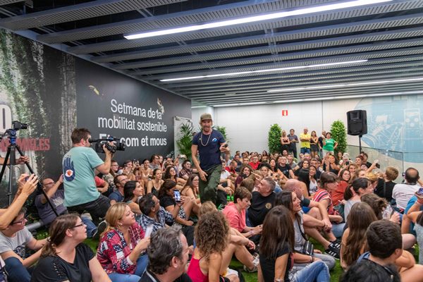 El cantant va connectar amb el públic que va acudir ahir al vespre al vestíbul de l'estació Fira, en una activitat de sensibilització emmarcada dins de la Setmana Europea de la Mobilitat.