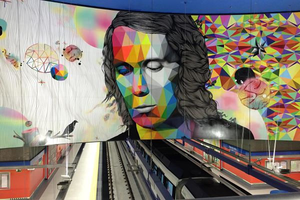 Una de les principals característiques d'aquesta estació de la línia 9 del Metro de Madrid és l'enorme i acolorit mural dissenyat per dos artistes urbans, Okuda San Miguel i Rosh333, amb la col·laboració de l'arquitecte Antonyo Mares i sota la direcció de Madrid Street Art Project. Els dos artistes van batejar el mural amb el nom d'Entre dos universos en referència al tema Entre dos aguas del guitarrista, ja que es poden observar dos universos en què es combinen figures geomètriques, colors, taques i línies corbes que fan del mural un espai que obsequia i rememora la riquesa cultural que va deixar Paco de Lucía.