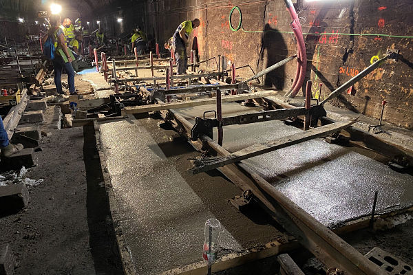 Al sector d’El Maresme / Fòrum, el formigó entra al túnel a través d’una conducció que travessa el vestíbul i baixa per l’escala de l’andana direcció La Pau.