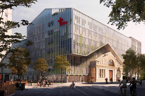 El Nou Hospital Evangèlic de Barcelona va posar la setmana passada la primera pedra del que serà la seva futura seu al districte de Sant Martí, un equipament d'atenció intermèdia que substituirà l'edifici actual del carrer Camèlies. Del projecte arquitectònic, que firma l'estudi PMMT, crida l'atenció com s'ha resolt la integració d'una part de la façana del que havia estat la cotxera d'autobusos de Lutxana, que es manté dreta al carrer Ciutat de Granada.