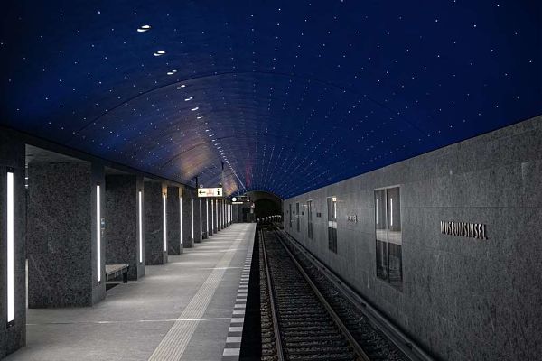 L'arquitecte suís Max Dudler està darrere de la construcció d'aquest peculiar espai subterrani. La característica especial d'aquesta estació és el seu brillant sostre blau, amb punts de llum per tot arreu que recorden un cel estrellat, inspirat en la famosa escenografia teatral que va crear el dissenyador alemany Friedrich Schinkel per a La flauta mágica de Mozart. “Sempre és de nit a l'estació de metro. Hi ha alguna cosa infinita en un cel estrellat. No saps on acaba. Volia crear aquesta sensació d'infinit", va afirmar Dudler a un mitjà alemany.