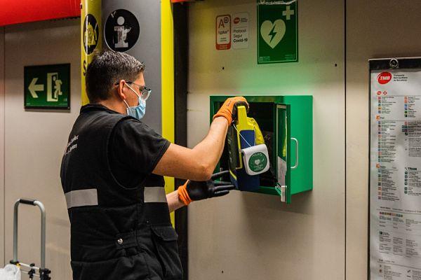 Com hem informat, des de l'estiu TMB està equipant amb desfibril·ladors totes les estacions de la xarxa de metro com a mesura de prevenció de les morts prematures per aturades cardiorespiratòries causades per una fibril·lació ventricular o una taquicàrdia ventricular sense pols. Són aparells que pot utilitzar qualsevol persona encara que no tingui coneixements sanitaris, tot i que el personal de Metro està rebent una formació específica. Actualment n'hi ha en 59 estacions, incloses totes les de les línies 2 i 11, tots els intercanviadors i la majoria d'enllaços.