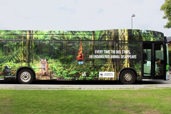 Com recull el web Cultura Inquieta, aquesta iniciativa de l’ONG conservacionista WWF a Dinamarca, desenvolupada per l'agència creativa Pong, va consistir a vinilar un bus estratègicament: un orangutan, un goril·la i un tigre desapareixien de la vista en obrir-se les portes per deixar pujar o baixar viatgers. Màxima visibilitat i efectivitat.
