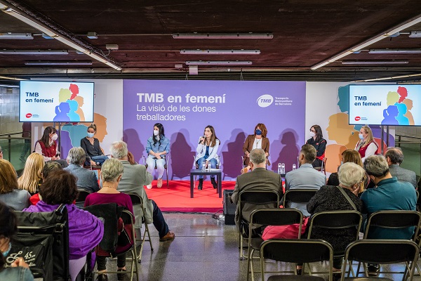 TMB en femení. La visió de la dona treballadora era el títol del col·loqui que va reunir sis dones de TMB, incloent la presidenta de l’empresa, Laia Bonet, que, amb la moderació de la cap de RSC, Dona i Diversitat, Raquel Díaz, van explicar com és i com ha estat al llarg dels anys treballar en un sector, el de la mobilitat, on força tasques són encara desenvolupades majoritàriament per homes.