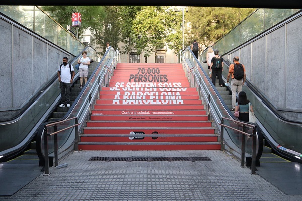 TMB col·labora per comunicar aquesta estratègia amb el suport en el vinilat dels accessos a les estacions de metro Universitat i Jaume I. A les escales es pot llegir la xifra de barcelonins i barcelonines que diuen sentir-se sols (70.000), el lema de la campanya (Contra la soledat, reconnectem), l’etiqueta per difondre-la per canals digitals (#Reconnectem) i el nou web barcelona.cat/soledat.