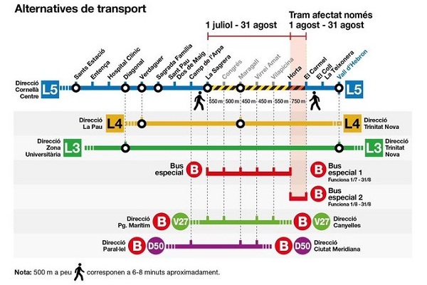 En l'àmbit del transport públic destaca especialment l'afectació ja iniciada a la L5 entre La Sagrera i El Carmel per obres de renovació de via i balast, travesses i fixacions. Fins al 31 de juliol hi hauran afectacions al tram La Sagrera - Horta i de l'1 al 31 d'agost al tram La Sagrera - El Carmel.