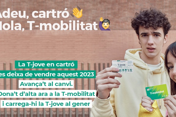 L’abonament T-jove serà el primer títol de transport que es deixarà de vendre en format cartró amb banda magnètica i que només estarà disponible per ser adquirit amb el sistema T-mobilitat. Aquest pas es farà efectiu durant els dos primers mesos de 2023 donant així un marge per a que totes les persones usuàries d’aquest títol que encara no estan adscrites al sistema T-mobilitat, facin el pas de forma progressiva.