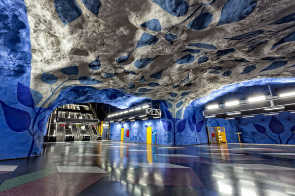 Comencem el recorregut a la cèntrica estació de T-Centralen, una de les més espectaculars. Va inaugurar-se el 1957 i va ser la pionera en allotjar obres d’art al seu interior, a més és el principal intercanviar de transport públic d’Estocolm. L’artista Per Olof Ultvedt va escollir els colors blanc i blau i el disseny de flors estilitzades i fulles pel seu efecte relaxant, ja que volia crear un ambient tranquil per als passatgers convidant-los a alentir el pas. Les tonalitats fredes també impregnen l’ambient d’un clima hivernal i la doten d'una empremta netament escandinava.