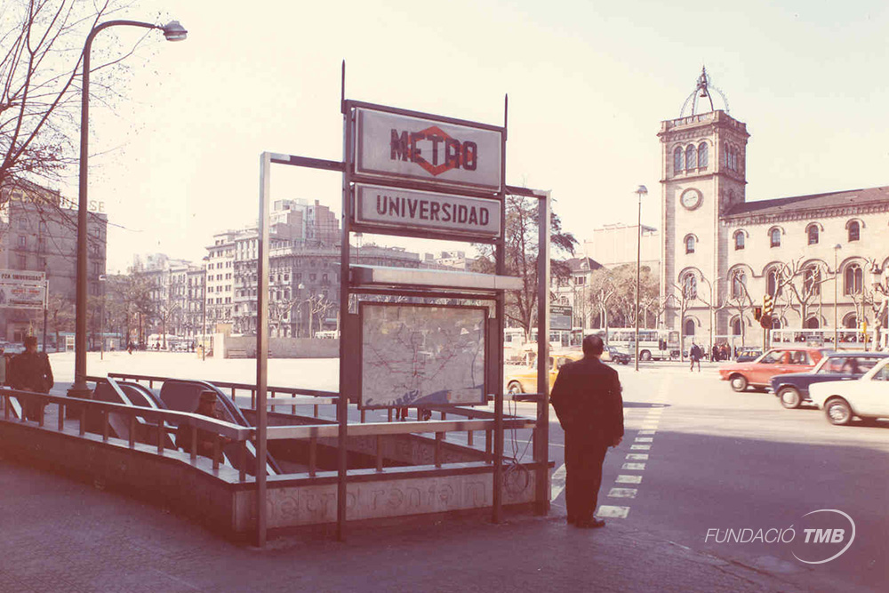 · Universitat: L’estació formava part del primer tram del Metro Transversal de l’any 1926 amb la denominació castellana, Universidad. Anys més tard, amb la reorganització de la xarxa de l’any 1982 va adoptar el nom en català, Universitat.