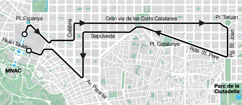 La prova esportiva afectarà tot el trànsit de superfície entre les 9 i les 12.30 hores, aproximadament. El recorregut de la cursa començarà a les 10 del matí a l’avinguda Maria Cristina i transcorrerà per plaça d’Espanya, avinguda Paral·lel, carrers Floridablanca, Calàbria, Gran Via, plaça Tetuan, passeig de Sant Joan, ronda de Sant Pere, pl. Urquinaona, pl. Catalunya, pl. Universitat, carrers Sepúlveda, Viladomat i de nou el Paral·lel, carrers Tamarit, Lleida i avinguda de Rius i Taulet, on finalitzarà la cursa. Les afectacions a l’avinguda Maria Cristina seran de 7 a 15 h, aproximadament.