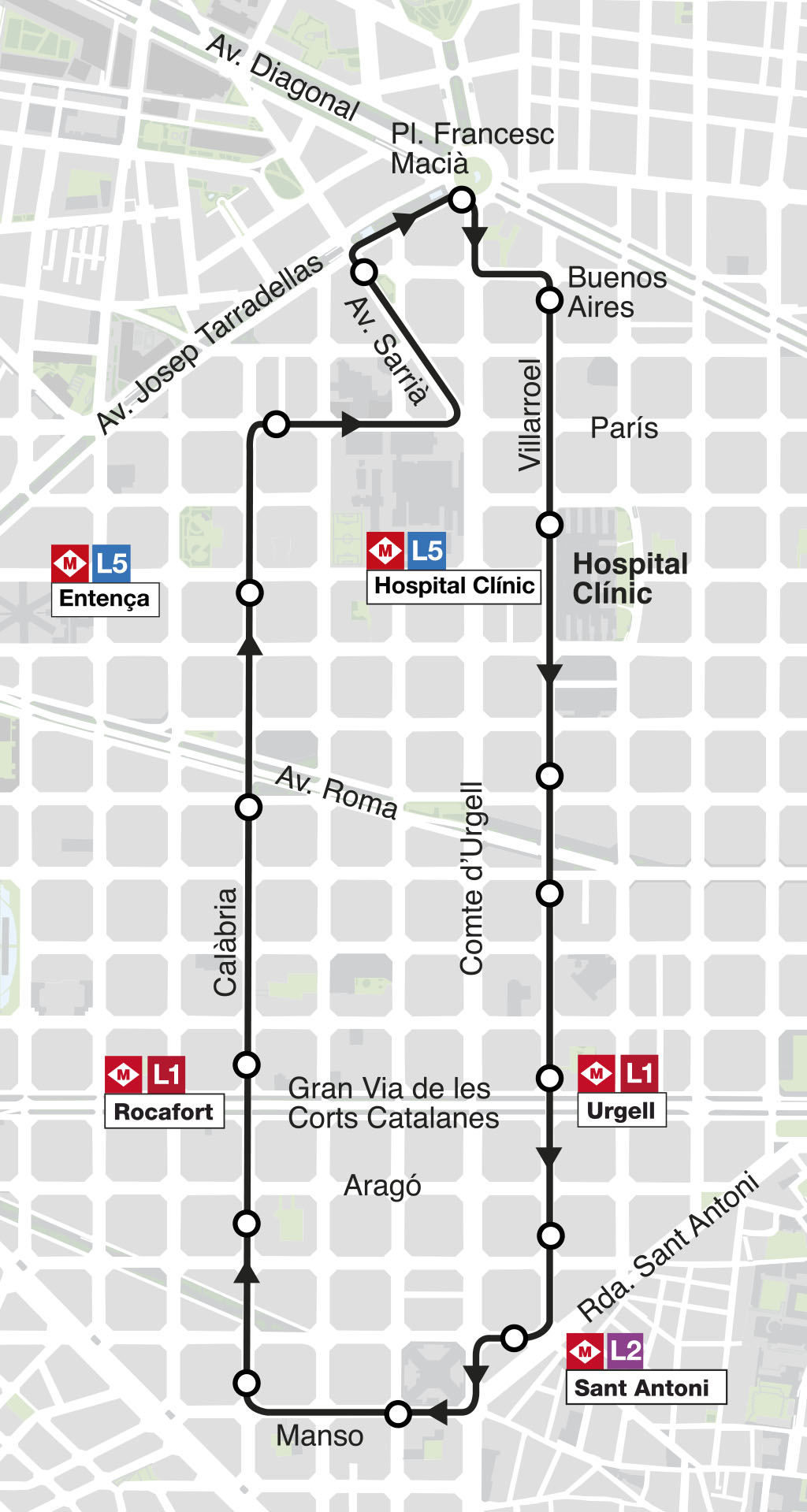 Amb aquest nou bus, que funcionarà de manera circular tots els dies de la setmana, es reforçarà el servei de transport de superfície al districte de l’Eixample. El recorregut és de 5,5 quilòmetres de longitud i 15 parades. S’hi ha assignat un bus tipus estàndard i la seva freqüència serà de 30 minuts.