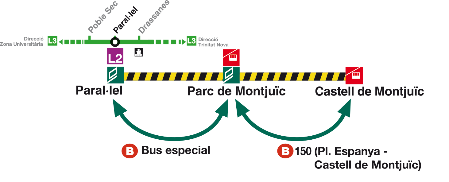 Durant els treballs de revisió del Telefèric, entre Parc de Montjuïc i Castell, TMB recomana fer servir com a alternativa la línia 150 de bus (Plaça Espanya - Castell de Montjuïc) que funciona tots els dies de la setmana de 7 a 21 hores. El recorregut i les parades de la línia es poden consultar al web de TMB. També hi arriba la línia 55 (Parc Montjuïc - Pl. Catalana), que els dies feiners circula de 4.55 a 22.40 h, els dissabtes de 5.50 a 22.40 h i els festius de 6.50 a 22.40 hores.