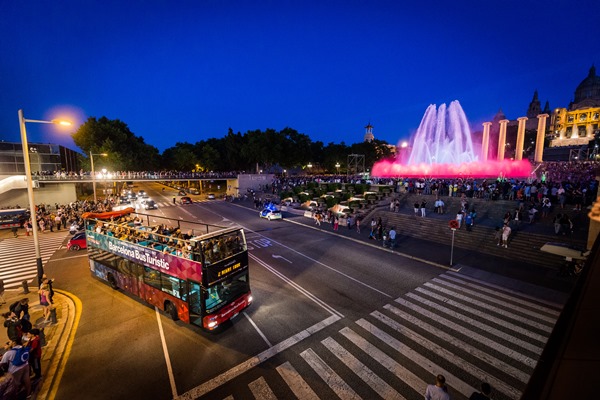 Aquest passeig nocturn únic inclou una parada a la Font Màgica de Montjuïc per assistir a l’espectacle de música i llum. Altres punts d’interès són la plaça de Catalunya, la Pedrera, la Casa Batlló, la Torre Agbar, el Teatre Nacional de Catalunya, l’Hospital de Sant Pau, la Sagrada Família, el passeig de Colom, les Drassanes, la plaça d’Espanya, Fira de Barcelona, Fundació Joan Miró i telefèric de Montjuïc, Jardins Costa i Llobera, Port, Caixaforum, Anella Olímpica, Parc de la Ciutadella, Estació de França i Arc de Triomf. A més, dalt del bus hi ha un informador que comenta, en tres idiomes (català, castellà i anglès), tot el recorregut per treure el màxim partit a la visita.