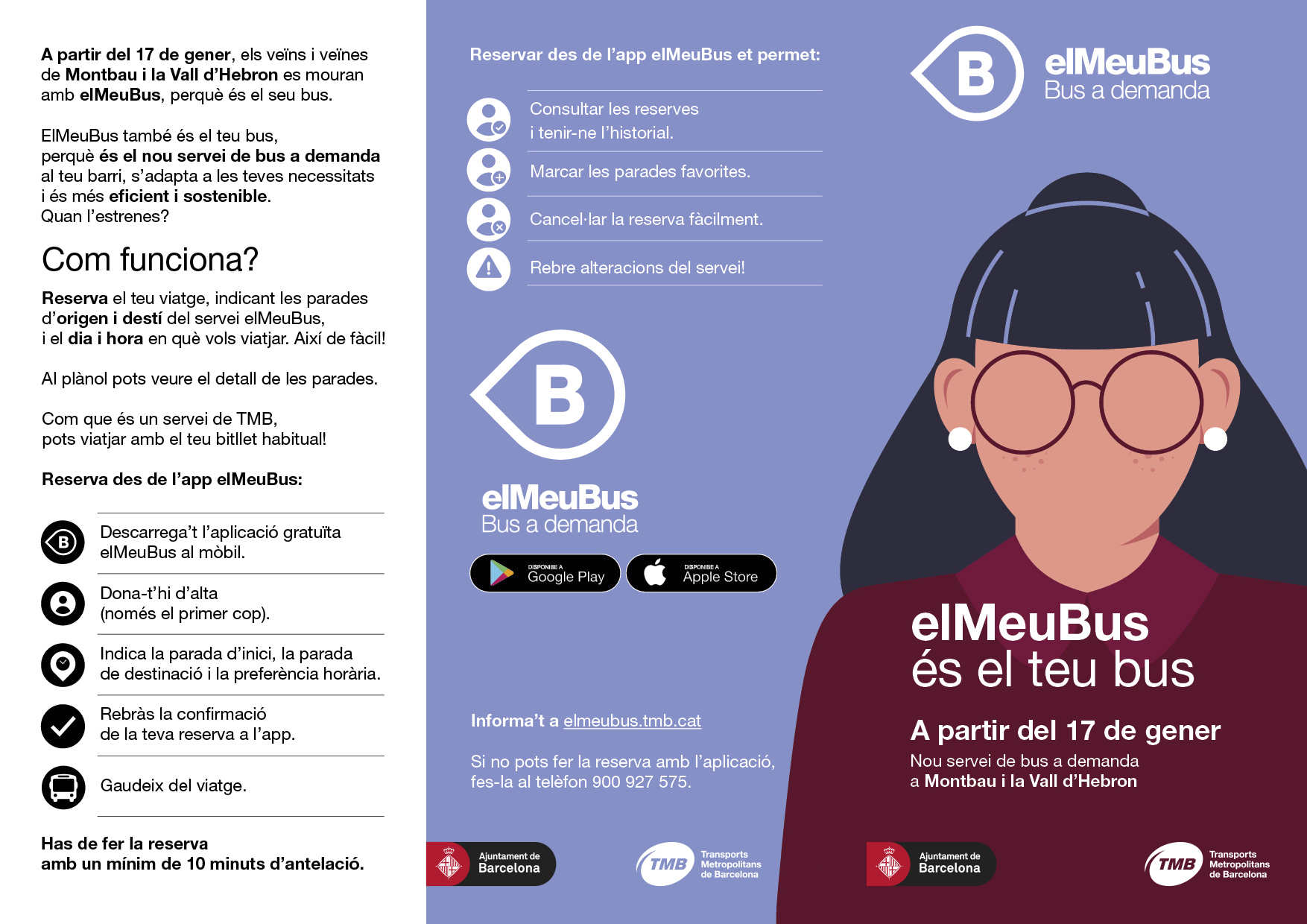 TMB i l’Ajuntament de Barcelona comencen avui a Montbau i la Vall d’Hebron la campanya informativa per explicar el desplegament del bus a demanda. S’han preparat cartells i fullets que distribuiran informadors als equipaments i entre els usuaris de l’autobús 135. També s’utilitzaran els sistemes d’informació dels autobusos i les parades, així com els canals digitals. Els dies 13 i 14 tindran lloc tallers pràctics adreçats als veïns per explicar-los amb més detall com poden fer la descàrrega de l’app i acompanyar-los en el procés de registre i primeres reserves.