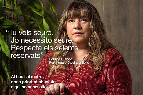 Al bus i al metro, dona prioritat absoluta a qui ho necessita, sota aquest lema Transports Metropolitans de Barcelona (TMB), en col·laboració amb l’Institut Municipal de Persones amb Discapacitat (IMPD) i l’Ajuntament de Barcelona, ha iniciat avui una campanya a les xarxes de metro i bus per reivindicar la prioritat dels espais reservats a les persones que ho necessiten, i ho fa amb testimonis reals de persones usuàries del transport públic. En concret són tres persones, l’Andrés Hinarejos, que té una lesió de la medul·la espinal i que en la campanya pregunta: "Si ocupes l'espai per a cadira de rodes, jo on em poso?". També hi apareix la Lorena Blanco, que porta una pròtesi a la tíbia i recorda: "Tu vols seure. Jo necessito seure. Respecta els seients reservats". I en Javier Rojano, que porta una pròtesi al genoll i explica: "Tu pots anar per les escales. Jo necessito l'ascensor".