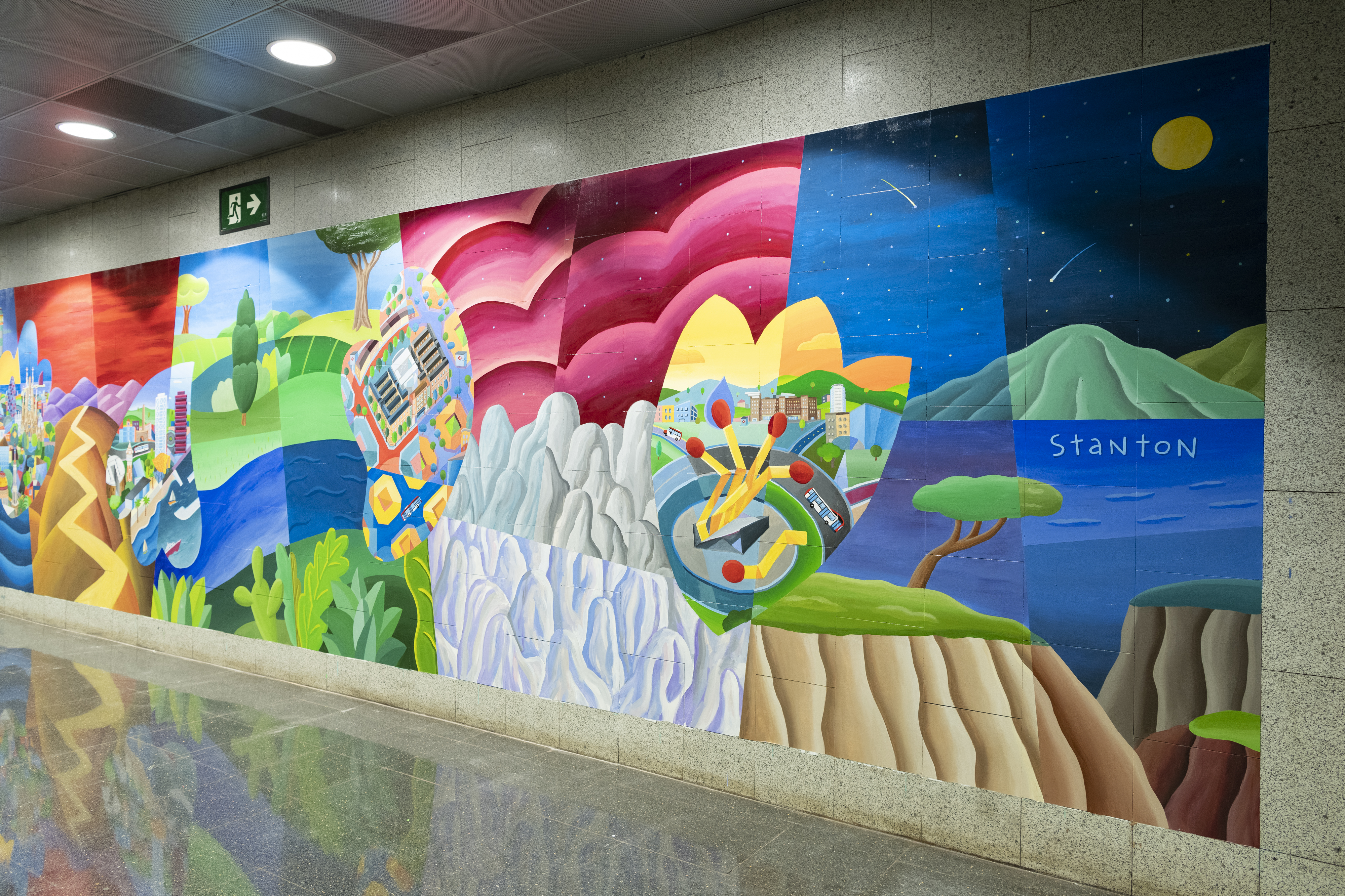 El mural, de grans dimensions, està dedicat també a la ciutat de Barcelona i al seu esperit de superació i resiliència, un cant a l’esperança, al positivisme i a la felicitat després dels durs mesos de confinament. L’obra mostra un paisatge cubista, colorista i mediterrani, un estil molt característic de l’artista i professor nord-americà Philip Stanton, resident a Barcelona des de fa més de 30 anys. Philip Stanton també ha comptat amb la col·laboració d’alumnes del curs de grau 2020 d’il·lustració creativa que imparteix l’artista a la Universitat Eina, Centre Universitari de Disseny i Art de Barcelona.