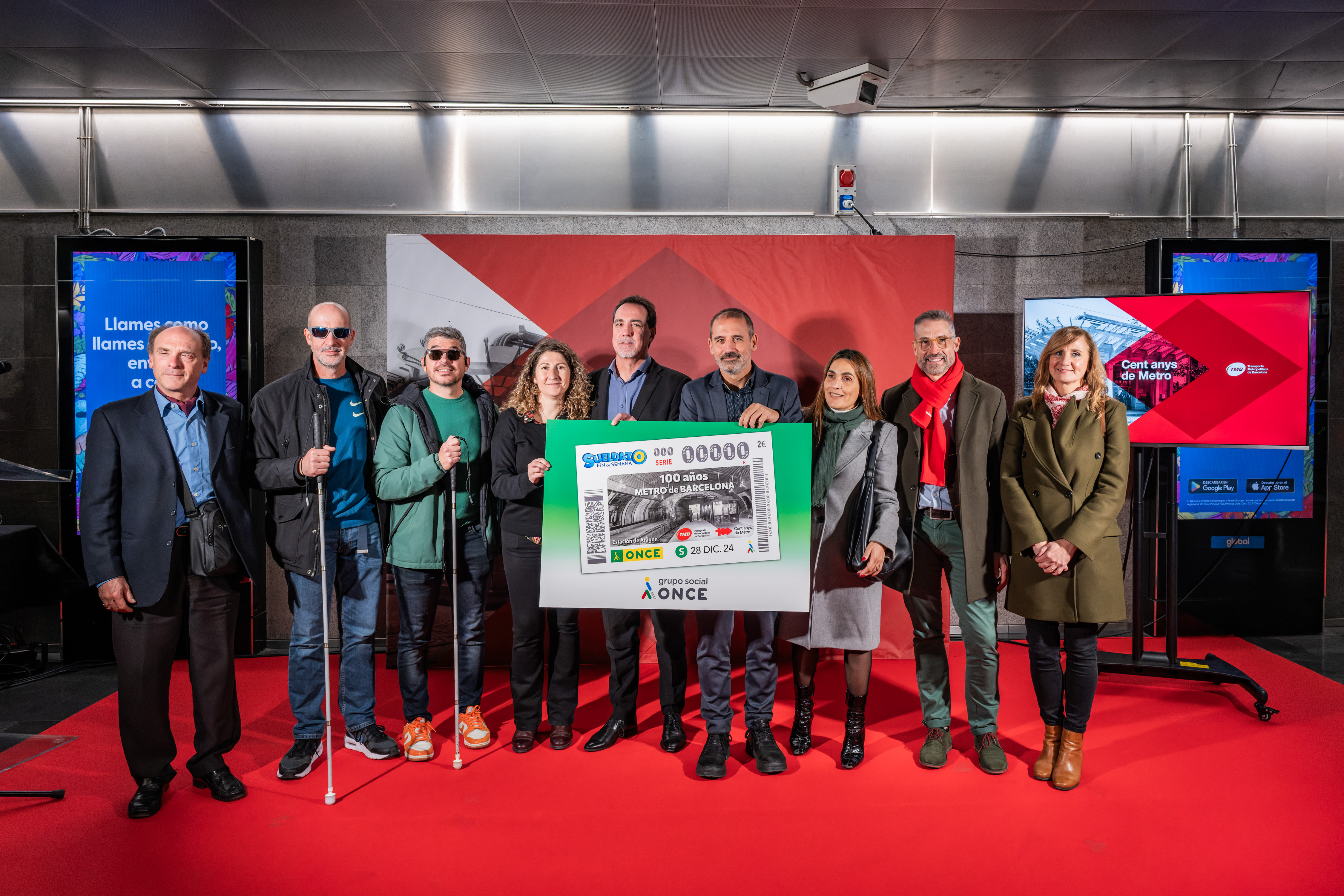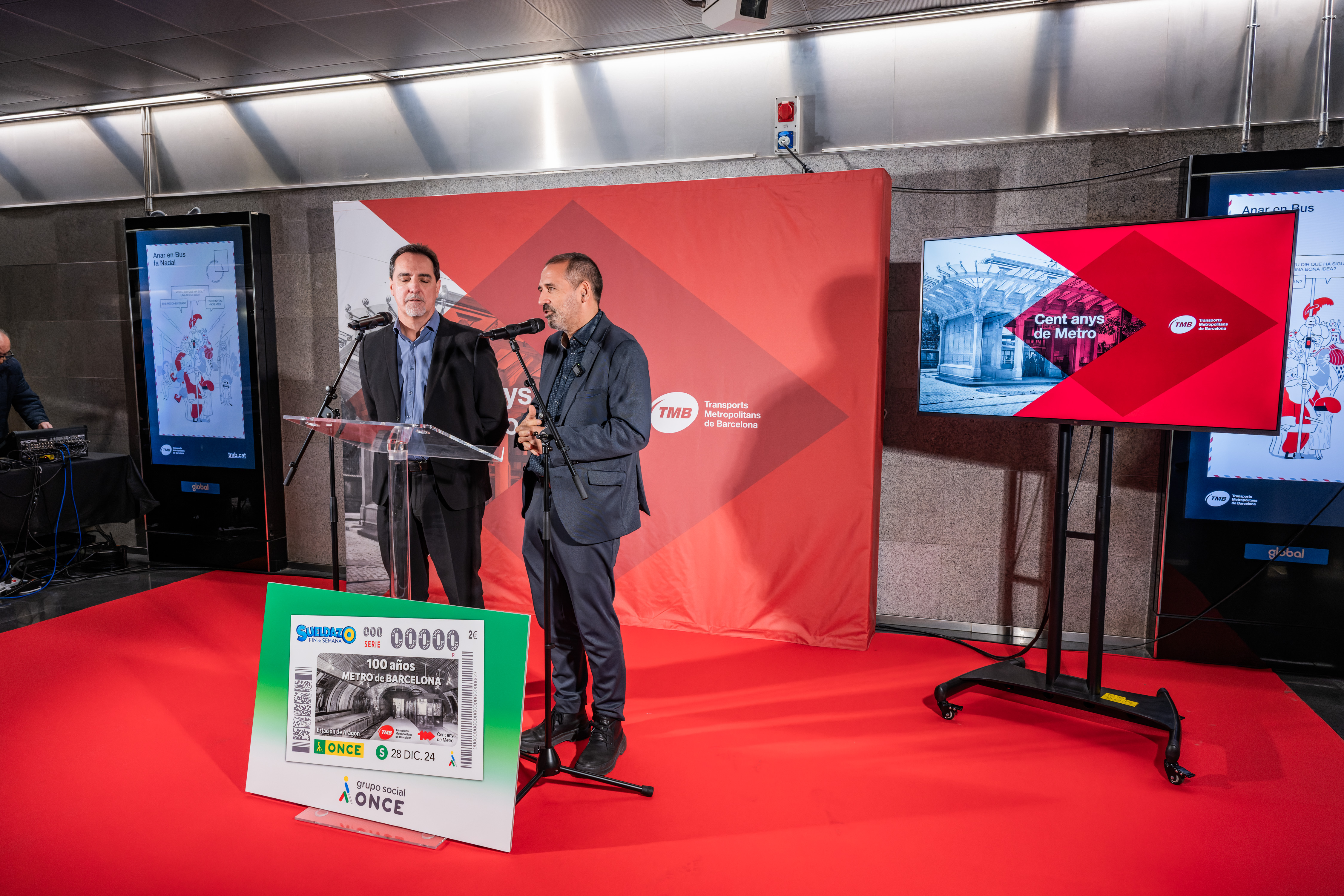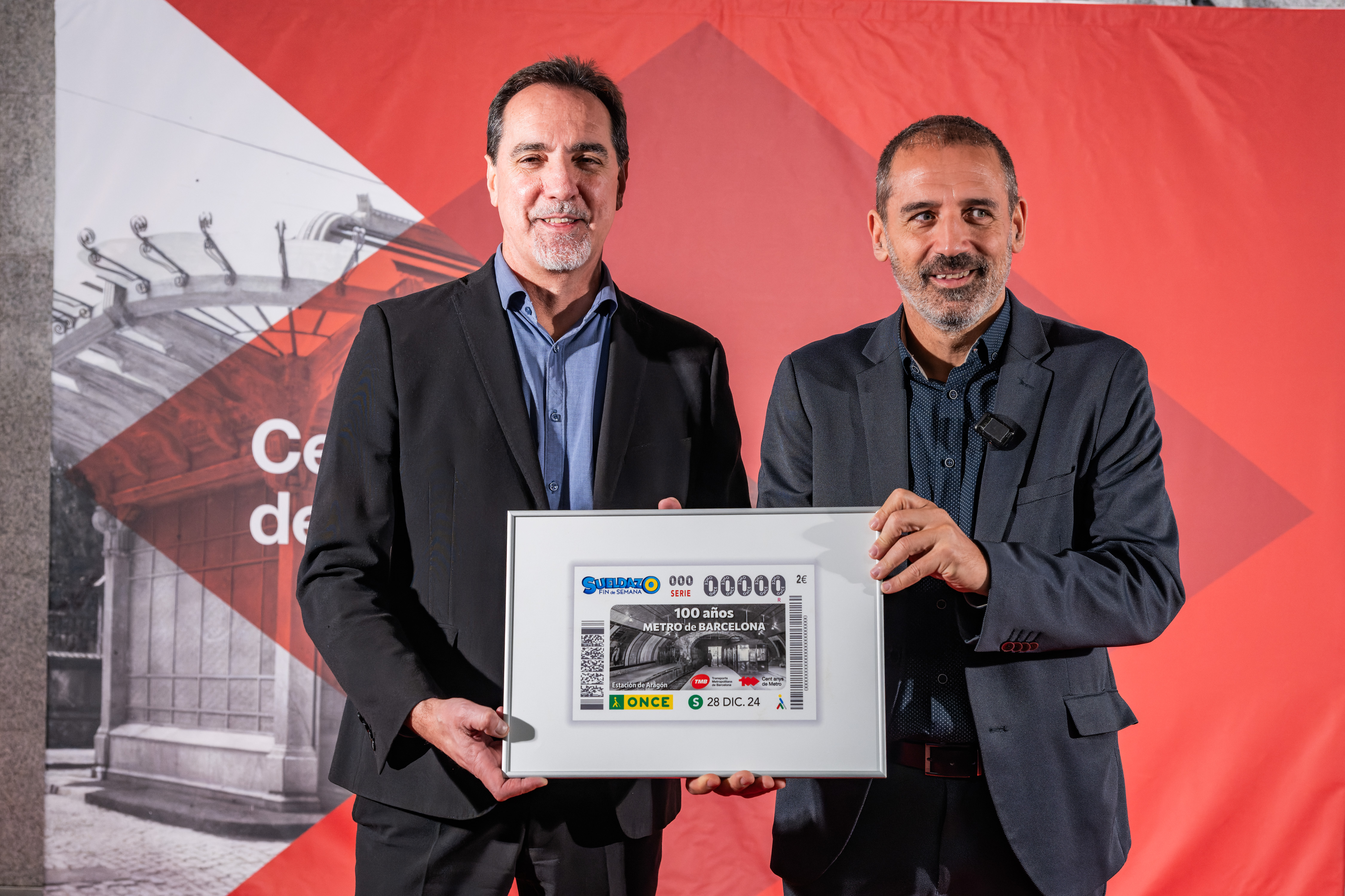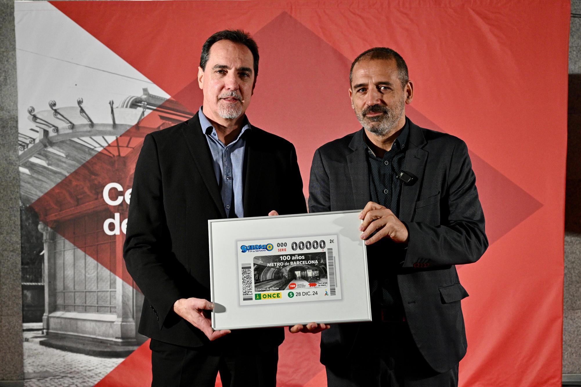 Transports Metropolitans de Barcelona (TMB) i ONCE Catalunya han presentat aquest migdia al vestíbul de l’estació de Diagonal un cupó especial de l’ONCE dedicat especialment al centenari del metro de Barcelona. Durant la presentació, Enric Botí, delegat d’ONCE a Catalunya, ha lliurat a Xavier Flores, conseller delegat de TMB, una reproducció emmarcada d’aquest cupó especial del centenari, il·lustrat amb una fotografia de Josep Brangulí d’un tren de la sèrie 300 entrant a l’estació del Gran Metro anomenada Aragón (actual Passeig de Gràcia L3) de l’any 1932. El cupó commemoratiu es posa a la venda demà i el sorteig se celebrarà el pròxim dissabte 28 de desembre. Fins a cinc milions i mig de cupons difondran l’efemèride.