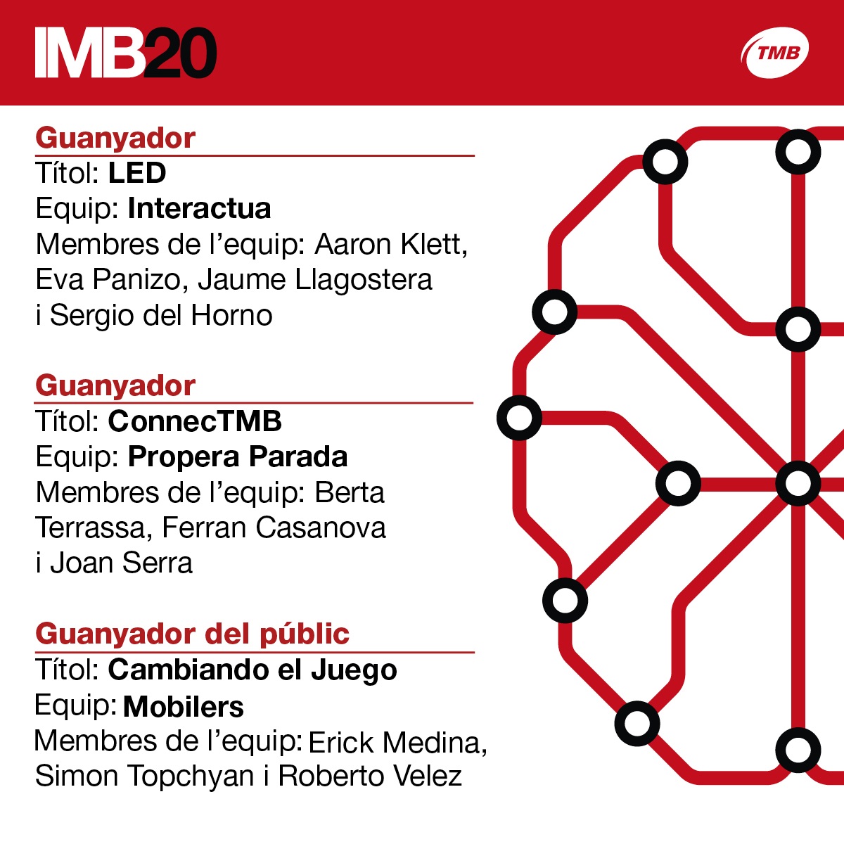 A més dels dos guanyadors, escollits per un jurat de TMB, les votacions populars han designat un premi del públic. És Canviant el joc, la proposta de l’equip Mobilers (Erick Medina, Simon Topchyan y Roberto Velez): una plataforma de gamificació amb recompenses per als usuaris.