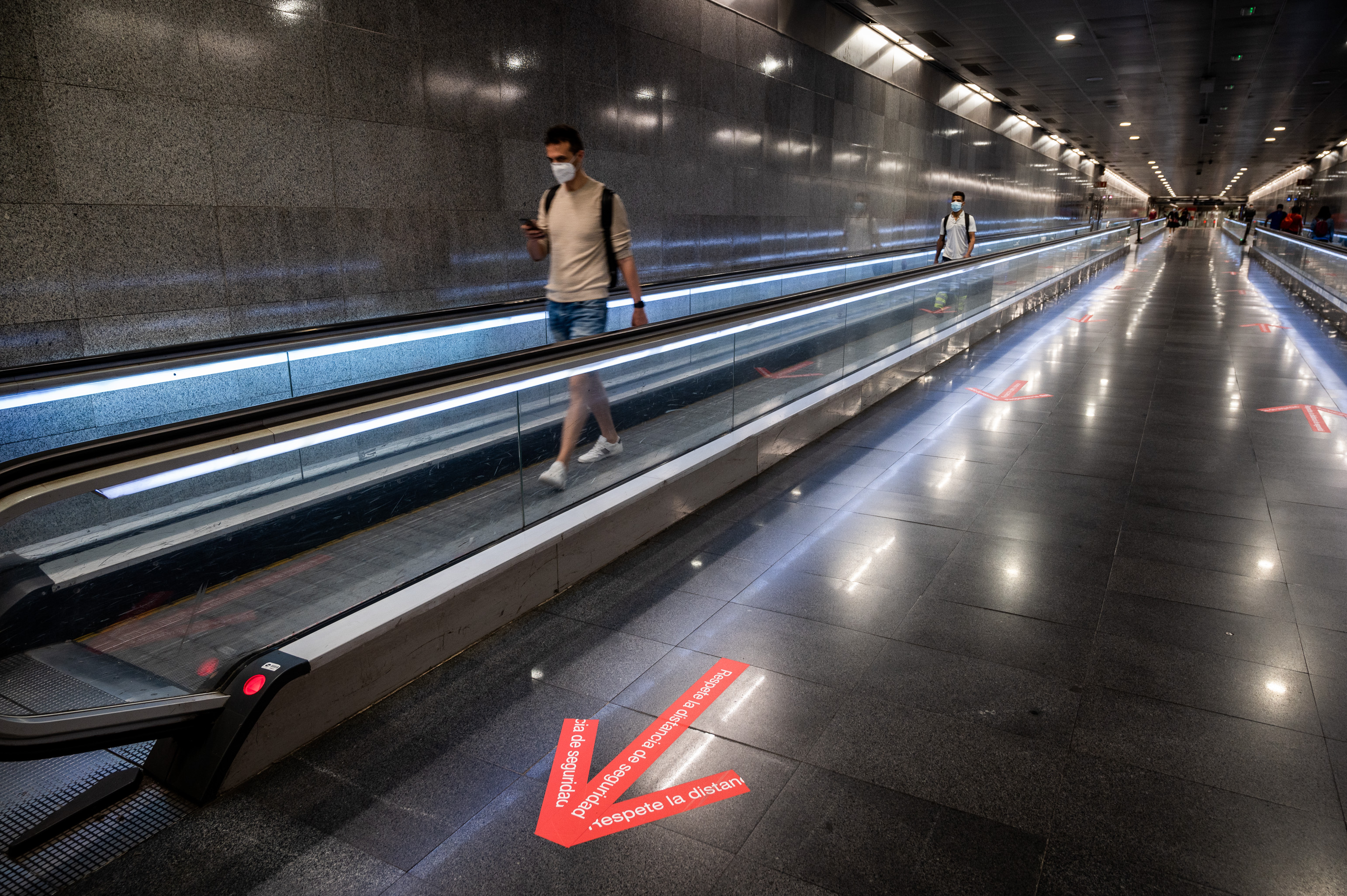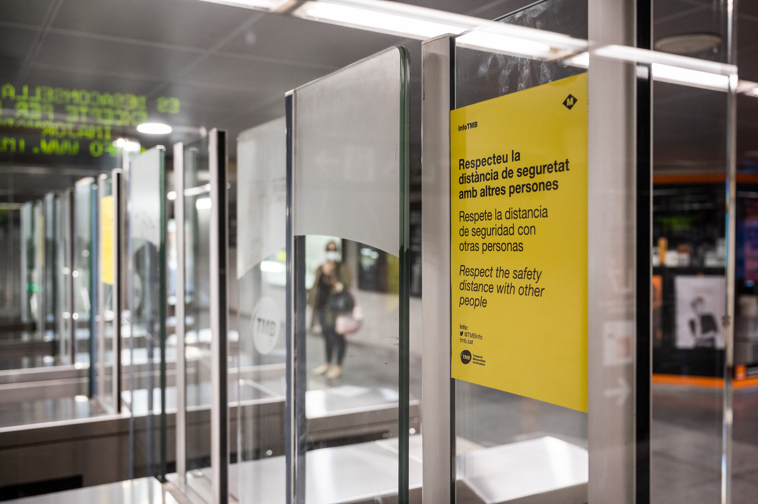 Dins de les actuacions per reforçar el respecte de la normativa de distanciament i prevenir aglomeracions, TMB està implantant una senyalització horitzontal en els enllaços de metro i estacions de més afluència, per ordenar el flux de passatgers. Les fletxes a terra inviten a caminar per la banda dreta i respectar la distància de seguretat en tot moment. Actualment ja estan senyalitzats els enllaços de Diagonal, Espanya, Urquinaona, La Sagrera, Sagrada Família i Verdaguer. Cartells amb la indicació de respectar la distància amb altres persones estan col·locats a les portes lliscants de les línies de peatge i les zones de venda de bitllets. A les portes dels ascensors es recorda a més que són d’ús preferent per a persones amb mobilitat reduïda.