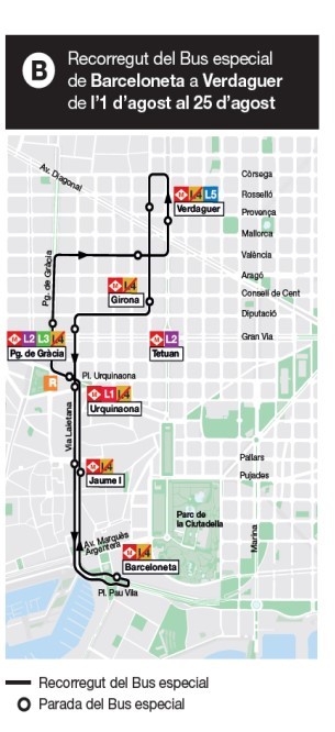 Fins al 25 d’agost el tall serà de Barceloneta a Verdaguer i l’alternativa de mobilitat més eficient és la pròpia xarxa de metro, tot i que es mantenen els reforços a les línies regulars de bus de la zona, així com els busos llançadora
