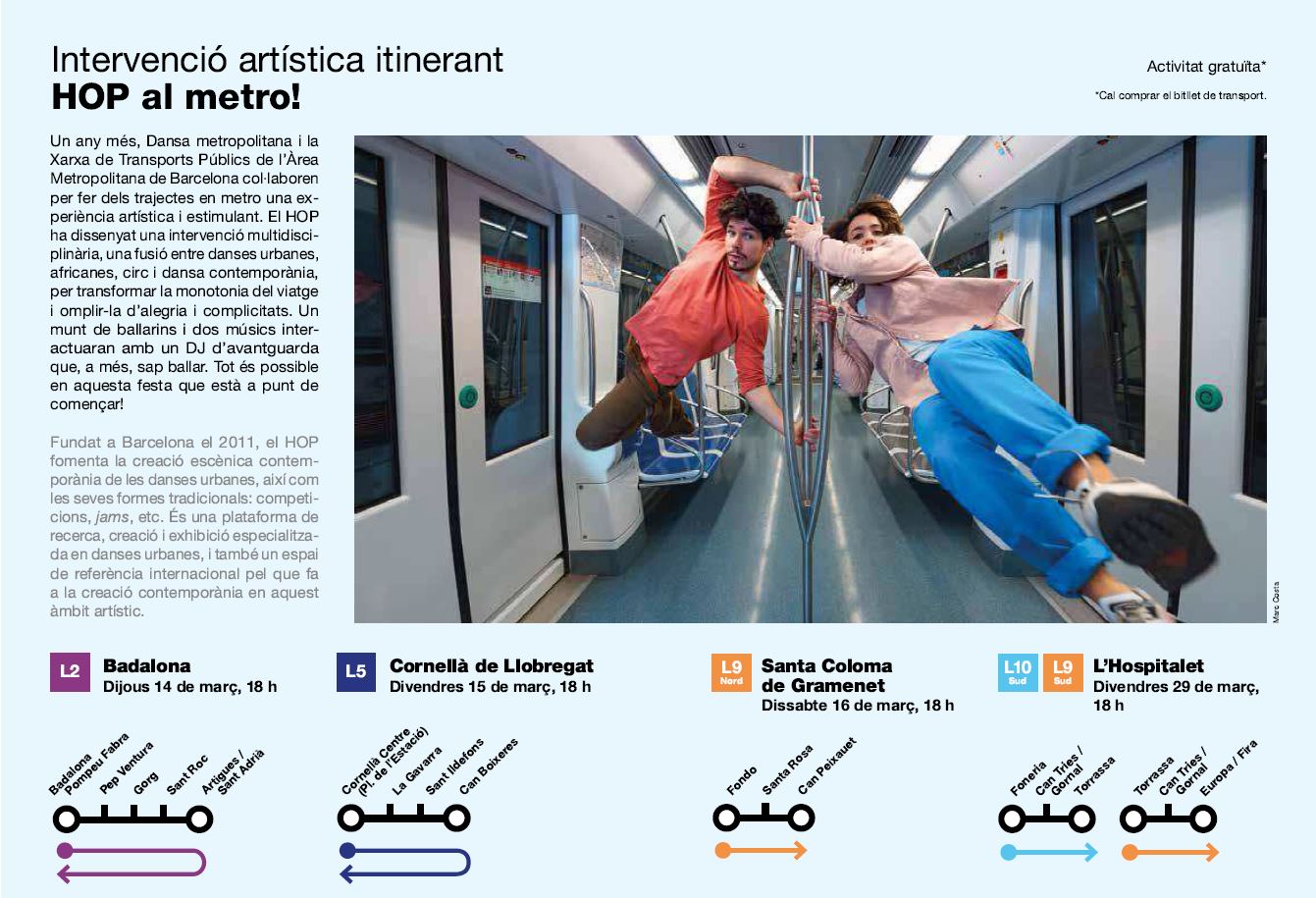 Un any més, el festival Dansa Metropolitana, en col·laboració amb Transports Metropolitans de Barcelona, torna a portar l'art del moviment al metro. Serà el segon any del festival i també la segona vegada que baixa al suburbà. Enguany ho farà de la mà de la plataforma HOP, amb una intervenció artística itinerant per diverses estacions de la xarxa.