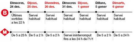 Com cada any, demà, dimecres 24 de desembre, la vigília de Nadal, els autobusos de Transports Metropolitans de Barcelona (TMB) faran l’última sortida des de les parades d’origen a les 22 hores i el servei de metro finalitzarà, com és habitual per aquesta festivitat, a les 23 hores.