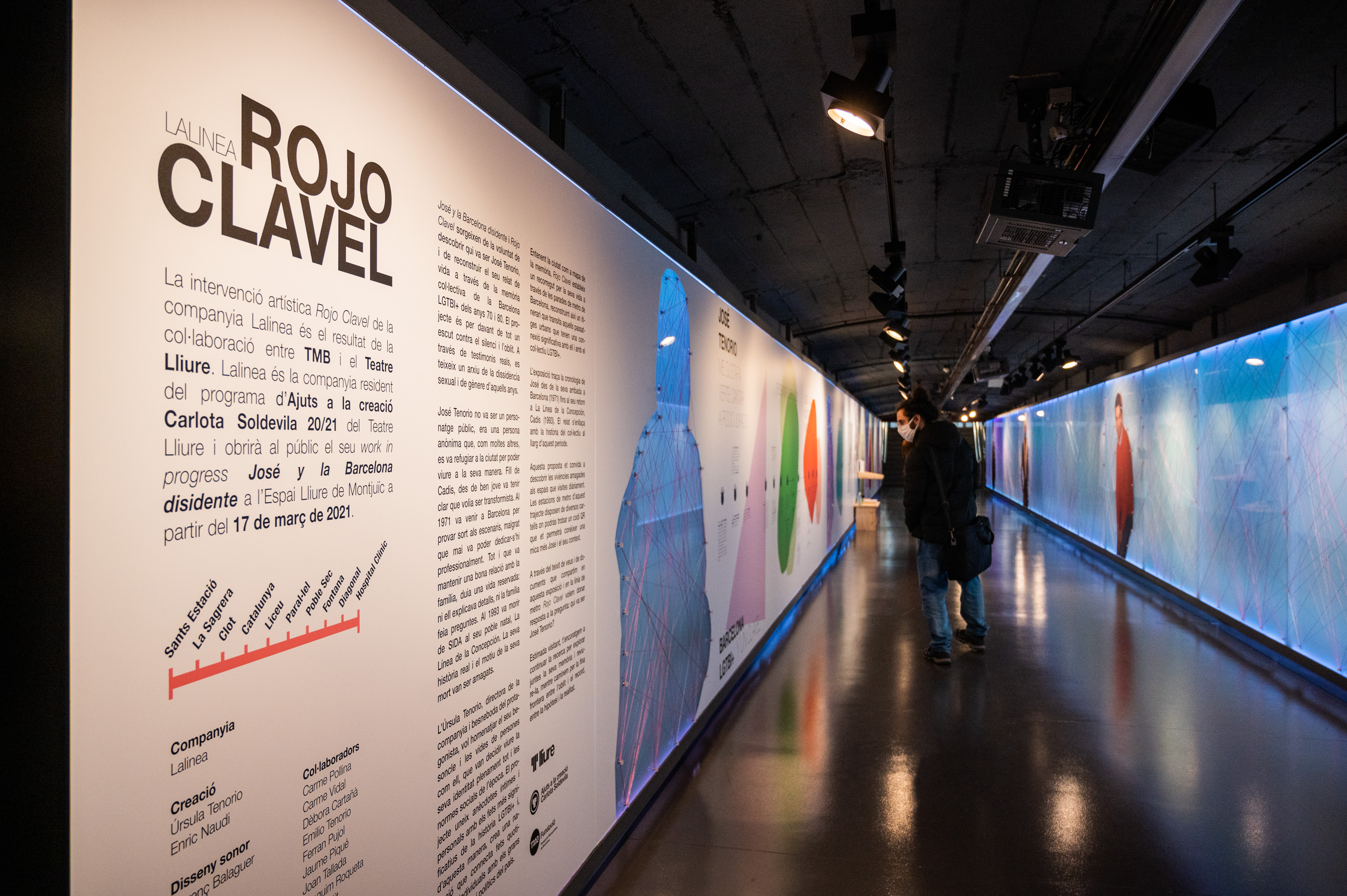 Rojo Clavel proposa una línia de metro fictícia que ressegueix el mapa de la memòria LGTBI de Barcelona, així com el recorregut de la vida de José Tenorio per la ciutat. A cada parada de la línia descobrirem una part de la història vital del José i del moviment LGTBI a través d’un codi QR que enllaça amb el contingut online. La intervenció artística compta amb una exposició complementària a l’Espai Mercè Sala que mostra plàsticament les connexions entre les estacions de metro, el moviment LGTBI i el nostre protagonista, José Tenorio.