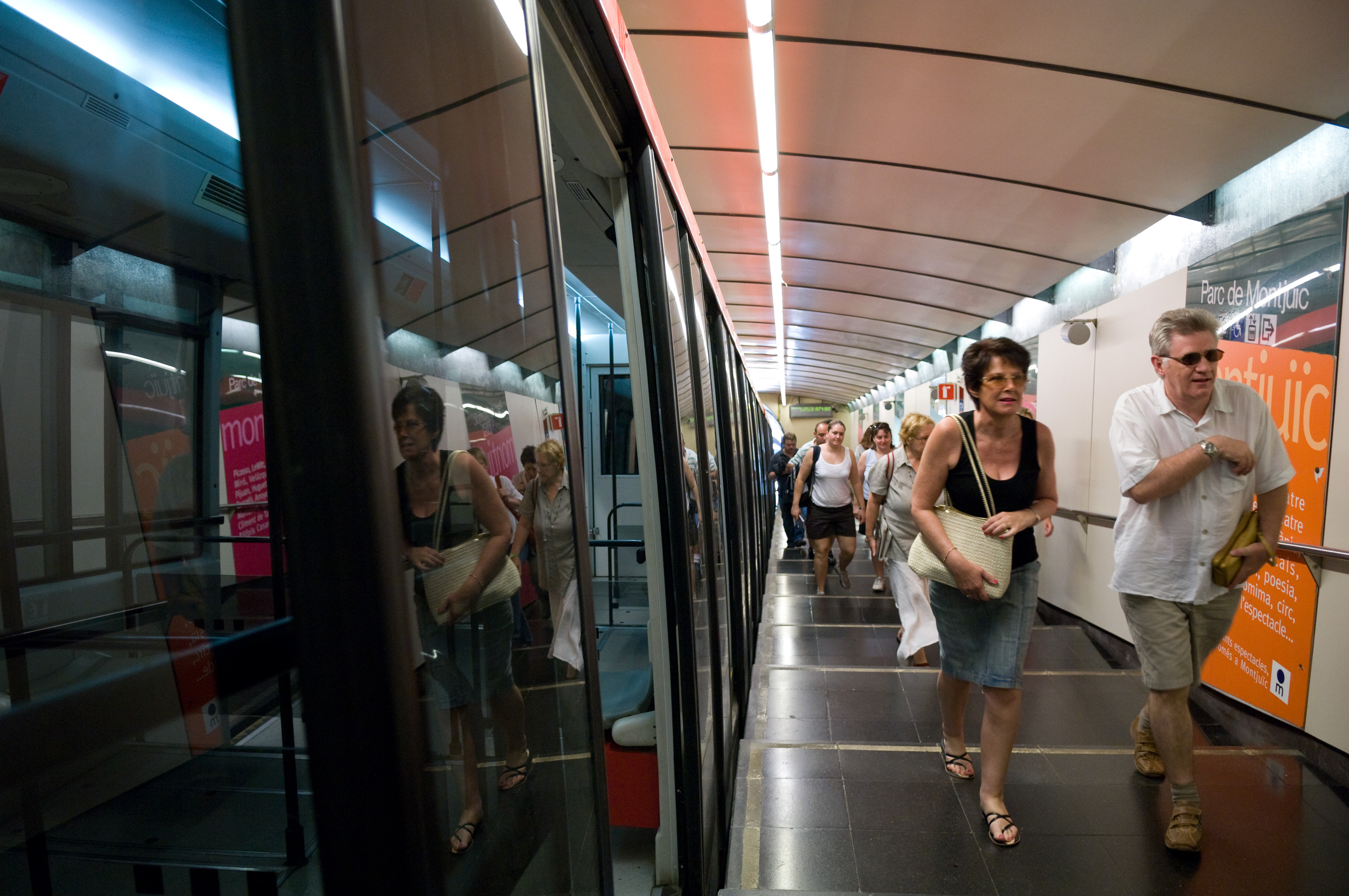 Imatge Vista general del funicular de Montjuïc davant la senyalització de PMR < >Vista general del funicular de Montjuïc davant la senyalització de PMR>