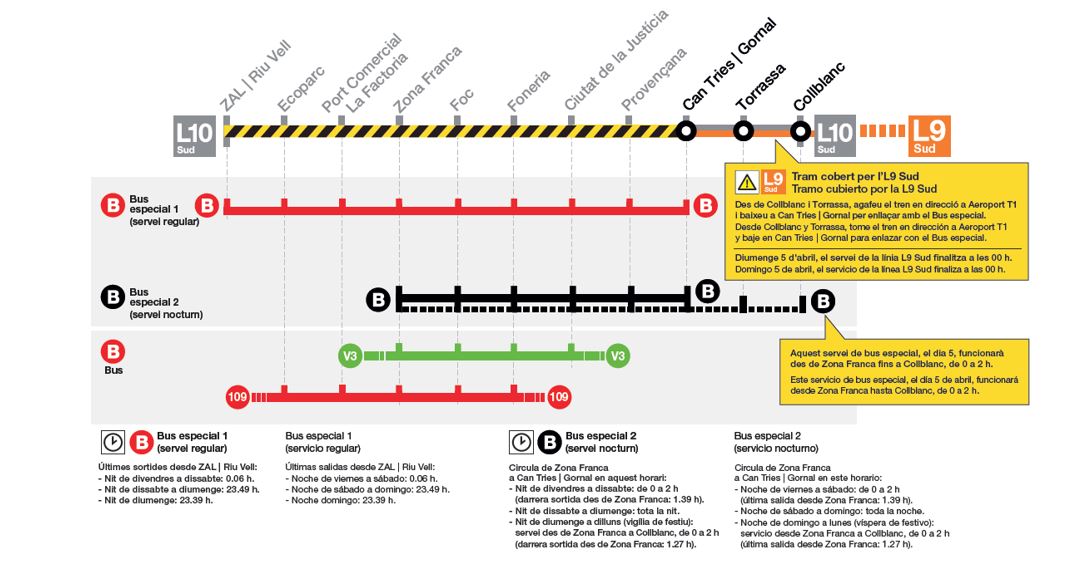 La nit del diumenge 5 d’abril, i per qüestions tècniques relacionades amb el tall, el servei de la L9Sud finalitzarà a les 00:00 hores enlloc de les 02:00. Aquesta afectació serà coberta també amb 8 autobusos llançadora des de Can Tries Gornal fins a Collblanc, perquè el passatge pugui enllaçar amb L1 a Torrassa i L5 a Collbanc.