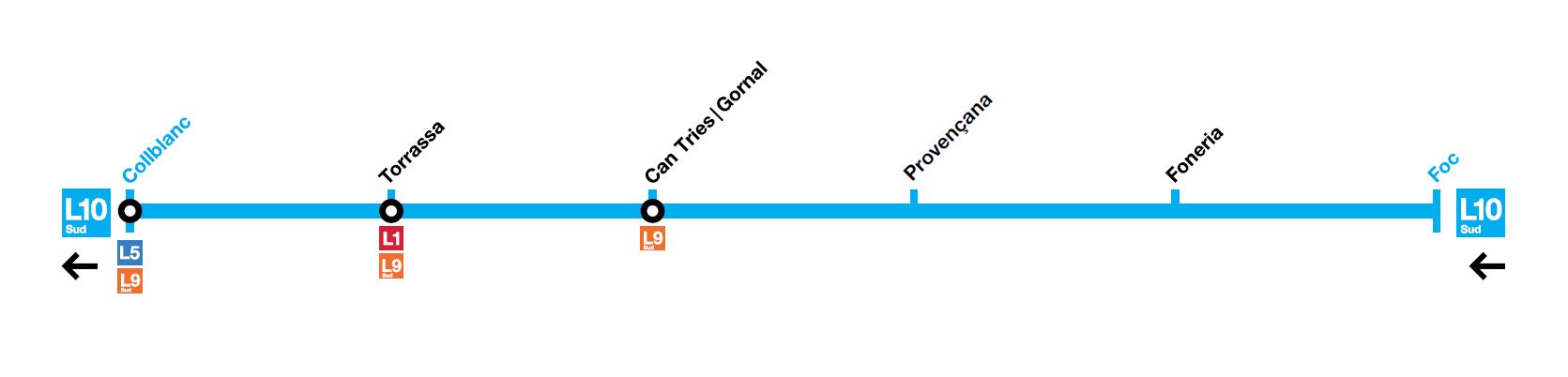 La L10 Sud, de funcionament automàtic sense conductor, va entrar en servei el 8 de setembre passat entre Foc i Collblanc, inicialment amb cinc estacions, de les quals tres són compartides amb la línia 9 Sud: Can Tries / Gornal, Torrassa i Collblanc.