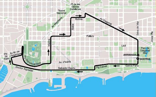 La Cursa dels Nassos, que tiene un recorrido de 10 kilómetros, saldrá a las 17.30 de la calle Selva de Mar y afectará todo el tráfico de superficie por donde se desarrolle: paseo Garcia i Faria, calle Salvador Espriu, Pla de Palau, avenida Marqués de l'Argentera, paseo Picasso, paseo de Circunvalación, avda. Icaria, calles Marina, Pallars, Álava, Bolivia, Ciutat de Granada, avda. Diagonal y de nuevo la calle Selva de Mar, donde finalizará la prueba deportiva. El paso de la carrera afectará 18 líneas de autobús de TMB: D20, V21, 6, 7, 14, 26, 36, 39, 40, 41, 42, 51, 59, 64, 71, 92, 141 y 192.