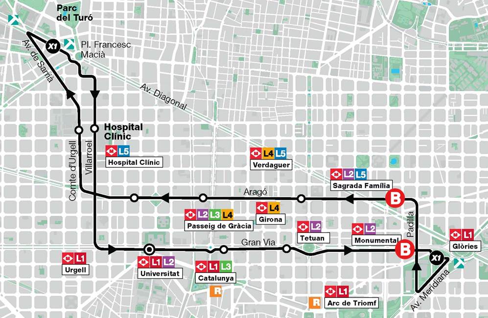 La línia semidirecta X1 de TMB enllaça el sector central de la ciutat (l’aglomeració comercial i de serveis de l’Eixample) amb els nodes de transport de les places de les Glòries i Francesc Macià on conflueixen les línies de tramvia T1, T2 i T3, en el primer cas, i T4, T5 i T6 en el segon. Es tracta d’un nou tipus de línia eficient orientada a la captació de nous usuaris del transport públic, en especial entre residents dels municipis metropolitans, que es distingeix per l’alta freqüència, de 8 minuts, i la rapidesa i la connectivitat.