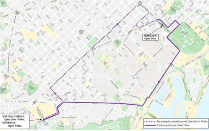 La cursa Open de 10 quilòmetres, la més llarga, sortirà de l’avinguda Rius i Taulet a les 8.30 hores del matí i afectarà tot el trànsit de superfície al llarg del recorregut. Els llocs principals seran: carrers Lleida, Tamarit, Entença, Gran Via, pg. de Gràcia, pl. Tetuan, pg. Sant Joan, Ausiàs Marc, Bruc, ronda Sant Pere, pg. Lluís Companys, Buenaventura Muñoz, Nàpols, pg. Pujades, pg. Picasso, av. Marquès de l’Argentera, Pla de Palau, pg. Isabel II, pg. Colom, pl. Portal de Palau, pg. Josep Carner, pl. Drassanes, av. Paral·lel, carrers Tamarit i Lleida fins a arribar de nou a l’avinguda Rius i Taulet.