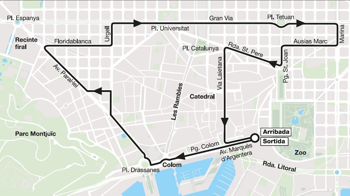 La cursa sortirà a les 9 del matí i afectarà tot el trànsit de superfície per tot el seu recorregut entre les 8 i les 14 hores, aproximadament. La prova sortirà de l’avinguda Marquès de l’Argentera i seguirà pel passeig Colom, avinguda Paral·lel, carrers Floridablanca, Urgell, Gran Via, Marina, Ausiàs Marc, pg. Sant Joan, ronda Sant Pere i Via Laietana, fins a arribar de nou al punt de sortida, on finalitzarà el circuit. TMB adoptarà les mesures necessàries per desviar els vehicles en funció dels llocs per on vagi passant la cursa.