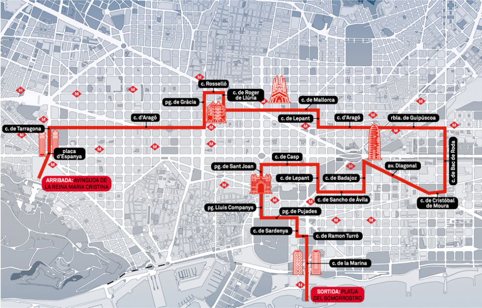 La sortida de la cursa serà a les 19 hores a la platja del Somorrostro per continuar pel carrer Marina, plaça dels Voluntaris Olímpics, carrer de Marina de nou, carrers de Ramon Turró, Sardenya, Pujades, passeig de Lluís Companys, passeig de Sant Joan, per continuar pels carrers de Casp, Lepant, Sancho de Ávila, Badajoz, avinguda Diagonal, carrers de Cristòfol de Moura, Bac de Roda, rambla de Guipúscoa, Aragó, Lepant, Mallorca, Roger de Llúria, Rosselló, passeig de Gràcia, reprenent altra vegada el carrer d’Aragó, carrer Tarragona, plaça d’Espanya i meta a l’av. Reina Maria Cristina, amb arribada prevista a les 21 hores.