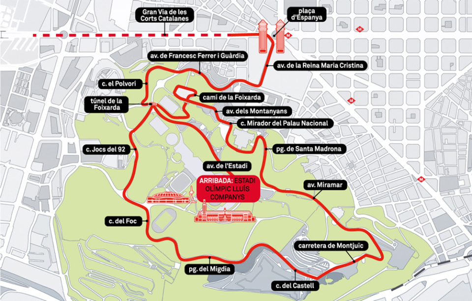 L’aïllament total del circuit serà de 15 a 17.30 hores. Les afectacions a la mobilitat a la zona de Montjuïc es preveu que comencin a les 16 hores, aproximadament.