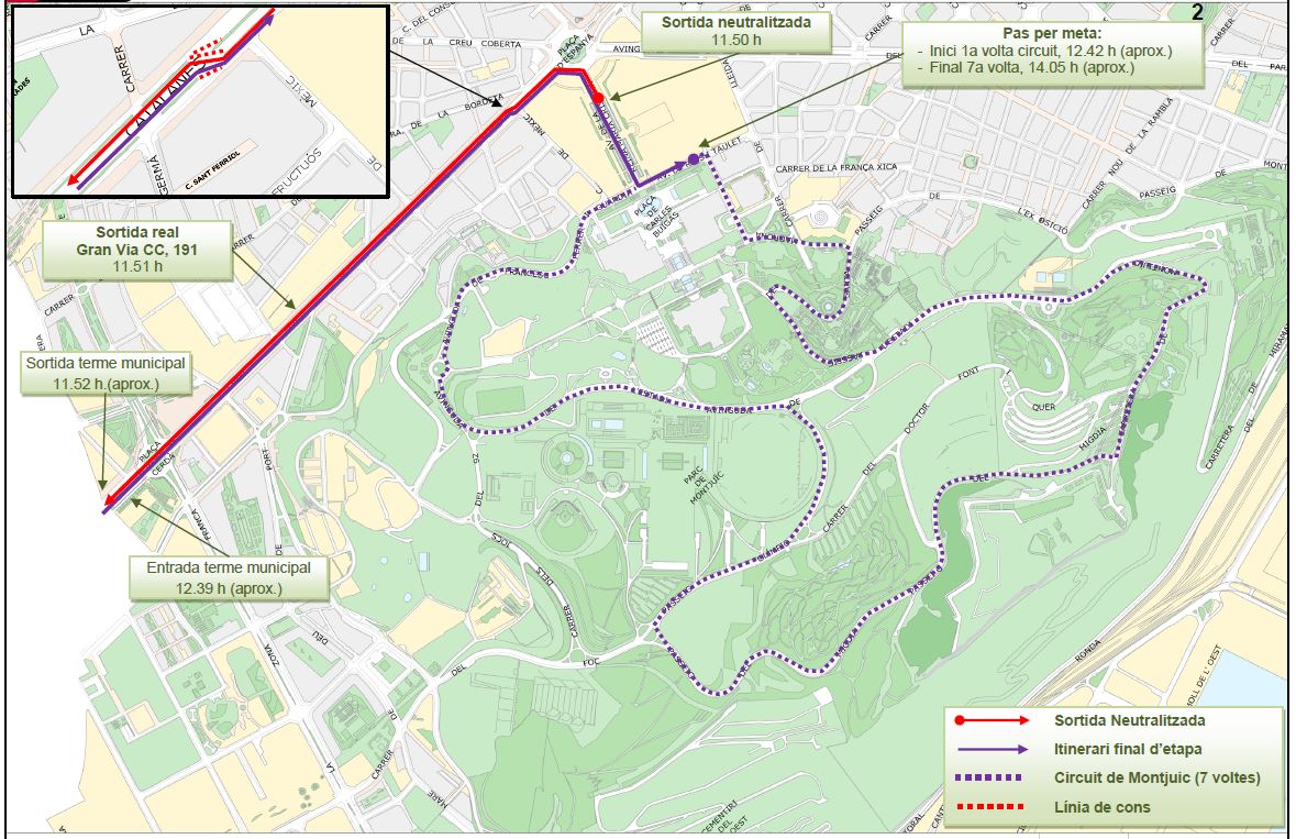 La Volta sortirà de forma neutralitzada des de l’av. Reina Maria Cristina a les 11.50 hores en direcció a pl. d’Espanya i carrers Creu Coberta i Moianès, per arribar a la Gran Via i continuar amb direcció als municipis de L’Hospitalet, El Prat, Sant Boi, Viladecans Gavà i Castelldefels, tornant cap a la ciutat de Barcelona per l’autovia de Castelldefels, pl. de Cerdà i, novament per la Gran Via, arribar a pl. d’Espanya, av. Reina Maria Cristina i av. Rius i Taulet, on s’inicia el circuit de set voltes, una més que en edicions anteriors, pel parc de Montjuïc i final d’etapa a av. Rius i Taulet.