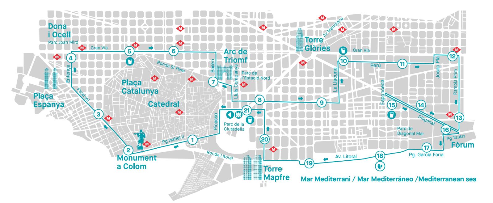 La cursa sortirà a les 8.30 hores del carrer Pujades i afectarà tot el trànsit de superfície a les artèries per on es desenvolupi la prova esportiva. La cursa seguirà pel passeig Picasso, avinguda del Marquès de l’Argentera, passeig Isabel II, passeig Colom, passeig Josep Carner, plaça de les Drassanes, avinguda Paral·lel, carrer Entença, Gran Via, carrer Bailèn, ronda Sant Pere, passeig Sant Joan, passeig Lluís Companys, carrer Bonaventura Muñoz, carrer Pallars, carrer Llacuna, carrer Perú, carrer Josep Pla, Gran Via, rambla Prim, avinguda Diagonal sentit Llobregat, carrer Espronceda, avinguda Diagonal sentit Besòs, plaça Llevant, passeig Taulat, carrer Selva de Mar, passeig Garcia Fària, passeig Calvell, avinguda Litoral, Port Olímpic, carrer Arquitecte Sert, carrer Salvador Espriu, carrer Marina i finalitzarà al carrer Pujades.