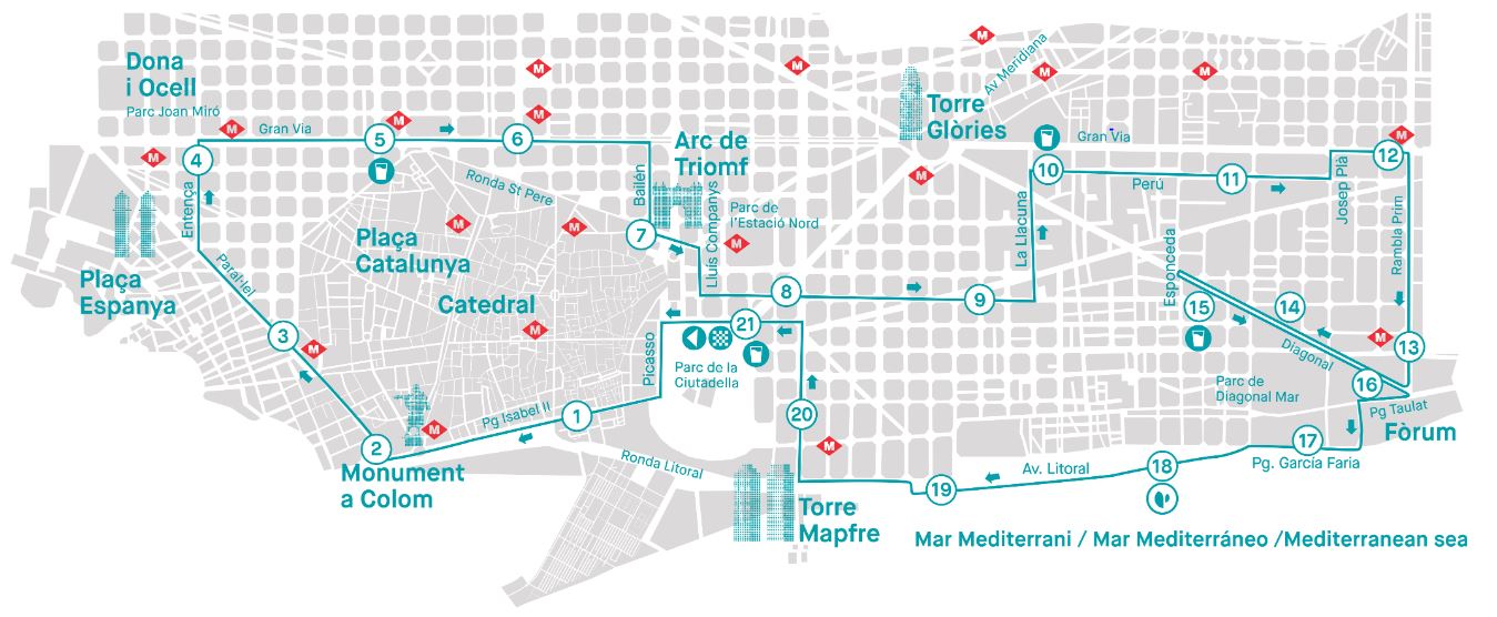 La cursa sortirà a les 8.30 hores del carrer Pujades i afectarà tot el trànsit de superfície a les artèries per on es desenvolupi la prova esportiva. La cursa seguirà pel passeig Picasso, avinguda del Marquès de l’Argentera, passeig Isabel II, passeig Colom, plaça Portal de la Pau, passeig Josep Carner, plaça de les Drassanes, avinguda Paral·lel, carrer Entença, Gran Via, carrer Bailèn, ronda Sant Pere, passeig Sant Joan, passeig Lluís Companys, carrer Bonaventura Muñoz, carrer Pallars, carrer Llacuna, carrer Perú, carrer Josep Pla, Gran Via, rambla Prim, avinguda Diagonal sentit Llobregat, carrer Espronceda, avinguda Diagonal sentit Besòs, plaça Llevant, passeig Taulat, carrer Selva de Mar, passeig Garcia Fària, passeig Calvell, avinguda Litoral, Port Olímpic, carrer Arquitecte Sert, carrer Salvador Espriu, plaça dels Voluntaris, carrer Marina i finalitzarà al carrer Pujades.