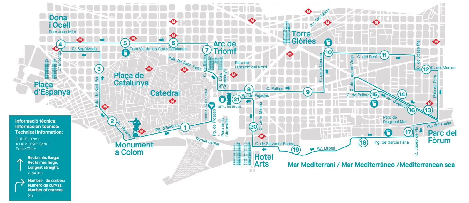 La cursa sortirà a les 8.30 hores del passeig Picasso i afectarà tot el trànsit de superfície a les artèries per on transcorri la prova esportiva. La cursa seguirà per l’avinguda del Marquès de l’Argentera, Pla de Palau, passeig Isabel II, passeig Colom, plaça Portal de la Pau, passeig Josep Carner, plaça de les Drassanes, avinguda Paral·lel, ronda Sant Pau, carrer Sepúlveda, carrer Entença, Gran Via, carrer Bailèn, ronda Sant Pere, passeig Sant Joan, passeig Lluís Companys, carrer Bonaventura Muñoz, carrer Pallars, carrer Llacuna, carrer Perú, carrer Josep Pla, carrer Marroc, rambla Prim, avinguda Diagonal, carrer Lope de Vega, carrer Pallars, plaça Llevant, passeig Taulat, carrer Selva de Mar, passeig Garcia Fària, carrer Jonquera, avinguda Litoral, Port Olímpic, carrer Arquitecte Sert, carrer Salvador Espriu, plaça dels Voluntaris, carrer Marina i finalitzarà al passeig Pujades.