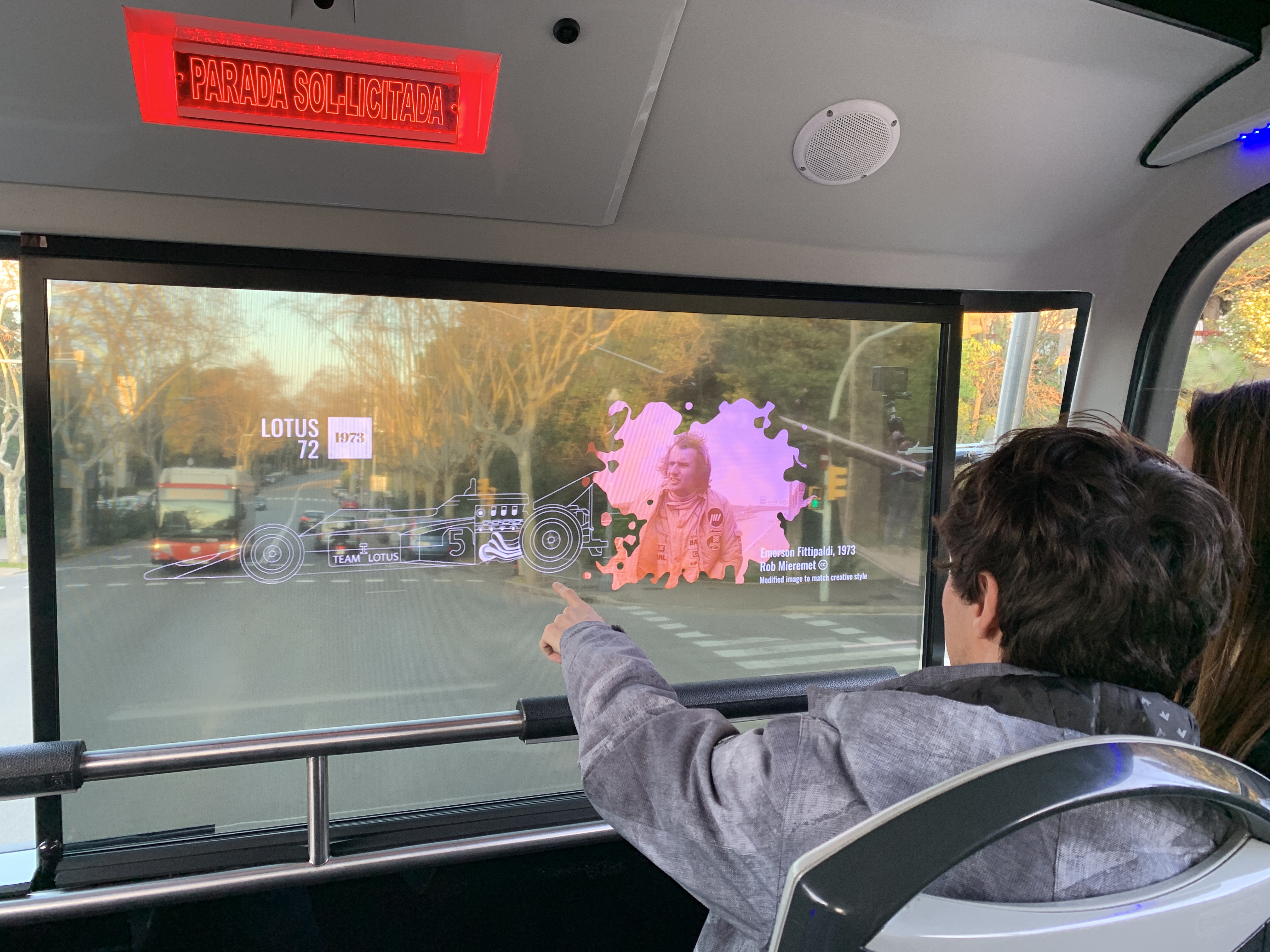 Les noves xarxes mòbils 5G permeten la descàrrega a temps real de continguts geocalitzats associats als llocs pels quals transcorre la ruta turística. Aquests continguts augmentats es visualitzen en una pantalla transparent i interactiva situada a la finestra davantera del vehicle, de mode que sobre la realitat que s’observa a través del vidre se superposen continguts multimèdia enriquits i interactius.