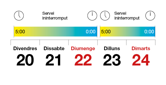 El metro donarà servei tota la nit del divendres 20, el dissabte 21 i el dilluns 23 de setembre. Pel que fa al diumenge 22 funcionarà fins a les 12 de la nit.
