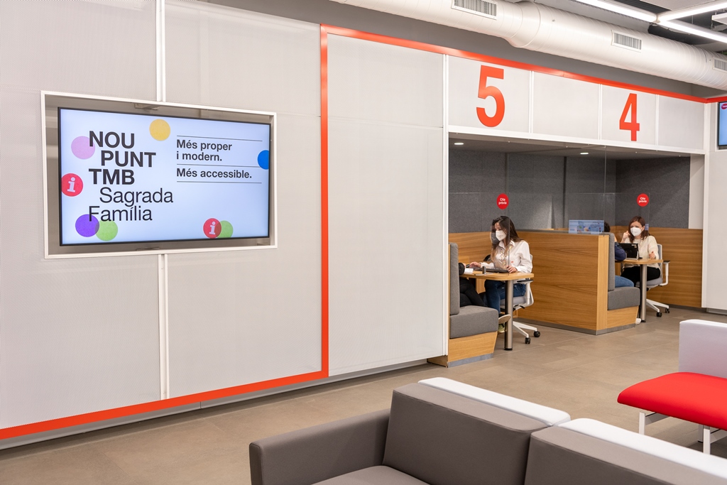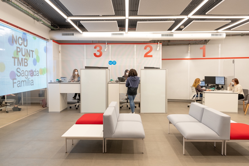 El Punt TMB de Sagrada Família, el quart centre d’atenció al ciutadà de TMB, s’ha dissenyat amb criteris de màxima eficàcia i d’accessibilitat universal. El centre incorpora la tecnologia SVision per donar suport a persones sordes i amb discapacitat auditiva que necessiten comunicar-se en llengua de signes, i serà el primer a fer-ho en la llengua de signes catalana. L’espai també està equipat amb un anell inductiu, connectat a la megafonia d’emergència i a l’equip de micròfon individual, per facilitar l’atenció a persones amb discapacitat auditiva. Aquests nous recursos d’accessibilitat de què disposarà l’oficina han estat implantats amb la col·laboració de la Federació de Persones Sordes de Catalunya. A més, el Punt TMB integra el gestor de torns i la tecnologia Navilens per millorar l’atenció a les persones amb discapacitat visual.